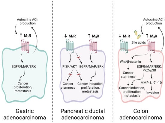 - Konishi, M.; Hayakawa, Y.; Koike, K. Role of Muscarinic Acetylcholine Signaling in Gastrointestinal Cancers. Biomedicines 2019, 7, 58. [Google Scholar] [CrossRef]