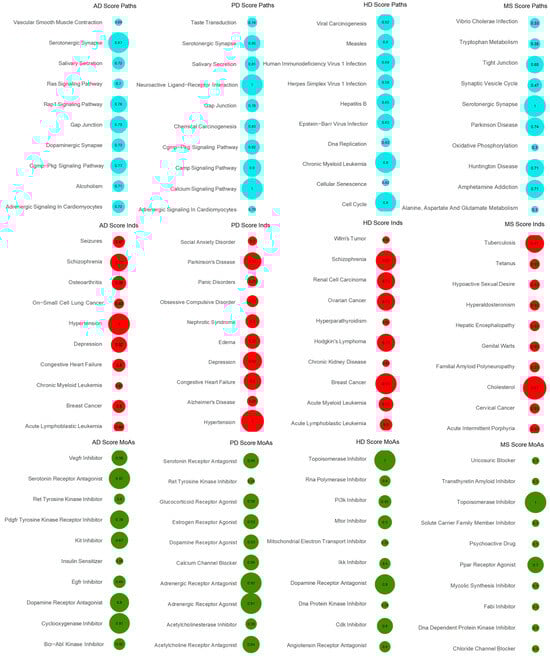 DC-matrix for CDRS. DC-matrices were generated for each disease per signature (Paths, MoAs and Inds) using the CDRS lists. The top 10 scored features are shown for each disease in a bubble grid chart. The number in the bubbles indicates the DC score of each modality (also encoded as the bubble size). Blue colour depicts Paths, red colour depicts initial Inds and green colour depicts MoAs.
