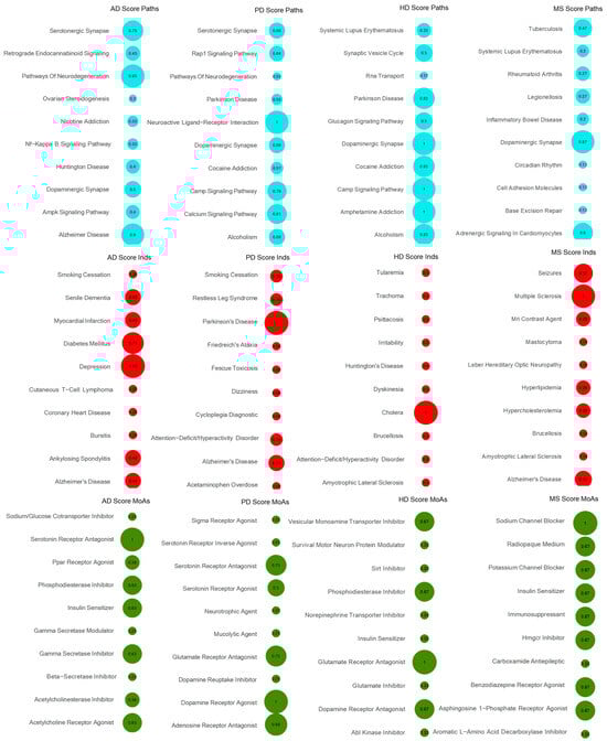 DC-matrix for CTS. DC-matrices were generated for each disease per signature (Paths, MoAs and Inds) using the CTS lists. The top 10 scored modalities are shown for each disease in a bubble grid chart. The number in the bubbles indicates the DC score of each modality (also encoded as the bubble size). Blue colour depicts Paths, red colour depicts initial Inds and green colour depicts MoAs.