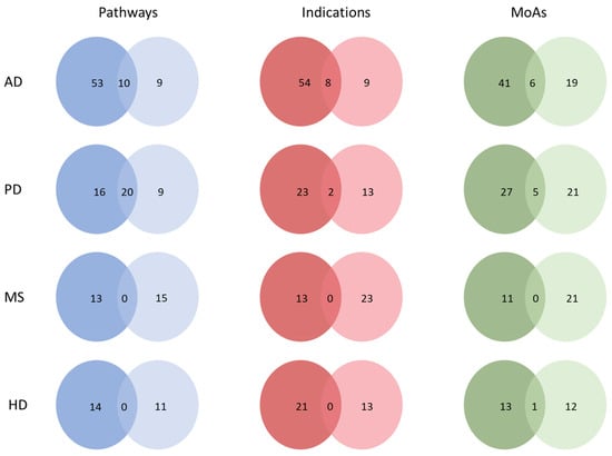 For HD, commonalities in CDRS and CTS were found only in MoAs. Specifically, one common element was detected, the dopamine receptor antagonist. One of the two FDA-approved drugs for HD, known as tetrabenazine, depletes dopamine by inhibiting the vesicular monoamine transporter 2 (VMAT2) []. On the other hand, for MS, no commonality was detected in either signature. These commonalities across CDRS and CTS suggest that repurposing studies and clinical trials are partially in agreement; however, there are also many unique findings. A hypergeometric test was conducted between the CDRS and CTS for the different diseases and modalities in order to assess the significance of overlap between the two lists. Statistically significant differences were detected for AD and PD across all modalities and for HD, only for MoAs (p-value < 0.05). Detailed p-values for all comparisons can be found in Supplementary Table S9.
