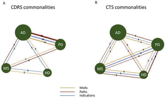 A disease–disease network was created to show commonalities between CTS and CDRS for all diseases (Figure 4). In CTS, results are more consistent and all components of the signature (MoAs, Paths and Inds) are shared by all four neurodegenerative diseases. On the other hand, for CDRS lists, for the two diseases (AD and PD) for which data were more abundant, we observed a stronger consistency in all components of the signature. Connections with MS and HD are weaker, with AD and HD sharing only Inds, HD and MS sharing MoAs and Inds and MS and PD sharing Paths and MoAs, whereas PD and HD have zero commonalities.