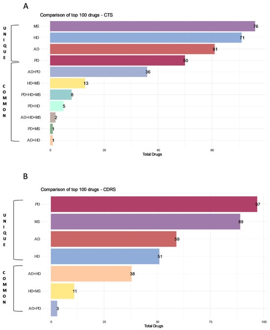 Comparison of the top 100 drugs generated from the super-reference table: (A). Comparison of top 100 drugs using CTS and (B) Comparison of top 100 drugs using CDRS. The top 100 drugs generated from the super-reference table of the Drug Repurposing Hub for AD, PD, HD and MS were compared. Unique drugs for each disease are shown, as well as commonalities among diseases.