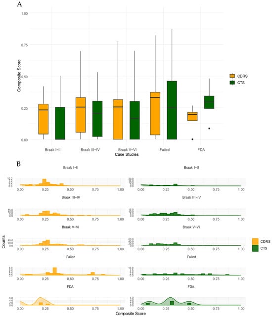 Plots of Composite Scores for AD case examples. (A). Box plots of Composite Scores of selected AD-related drugs (Braak I–II, Braak III–IV, Braak V–VI, FDA-approved and Failed) were generated using the CDRS and CTS reference tables. Black dots show the outliers. (B). Distribution histogram of Composite Scores of selected AD-related drugs using the CDRS and CTS reference tables.
