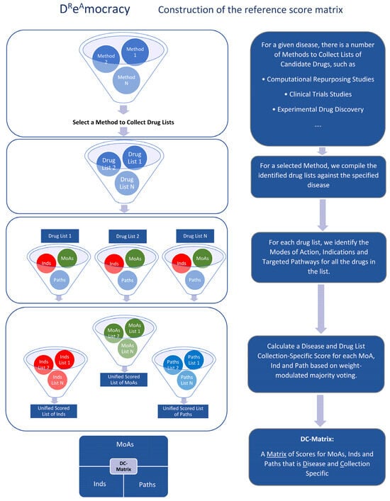 DReAmocracy integrates disease-specific drug lists generated by various drug discovery approaches. The drug collection methods that are selected in this work are (1) drug lists from the computational drug repurposing studies (CDRS) and (2) drug lists from the clinical trial studies (CTS). In addition, there is an option to generate a consensus scheme between the data from the two methods. The general pipeline of DReAmocracy is presented in Figure 7. In Step 1, the construction of the reference score-matrix is carried out by choosing the method of interest to collect lists of drugs. These lists could be from CDRS, CTS, experimental drug discovery or any other method available that generates drug lists. The selected diseases for this purpose belong to the spectrum of neurodegeneration, as previously mentioned. For this purpose, we used CDRS and CTS for AD, PD, HD and MS. In Step 2, for each drug list for each method, we identified the MoAs, Inds and Targeted Paths for all the drugs in the list. In Step 3, we calculated a disease/collection-specific score for each MoA, Ind and Path, known as the DC score, based on weight-modulated majority voting. Lastly, in Step 4, a DC-matrix, which is a matrix of DC scores for MoAs, Inds and Paths that is disease and method-specific, was generated.