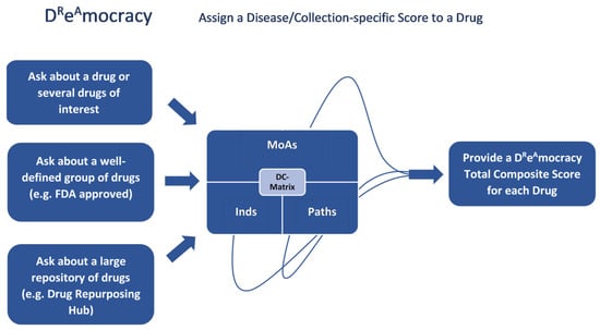 This available a priori knowledge can turn into novel information regarding a specific drug of interest. To do so, we designed and developed a methodology named DReAmocracy, which exploits this huge pile of information, in a resolution beyond the nominal reference of the drug per study. Specifically, information such as the drugs’ mechanisms of action (MoAs) with their initial indications (Inds), as retrieved from the Drug Repurposing Hub, and the targeted pathways (Paths), as obtained from the KEGG Pathway Database, is subjected to weight-modulated majority voting schemes to score and finally prioritise the candidate drugs against a disease. This methodology is not a predictive model; yet, it gives scoring power to the user based on user-selected preferences, offering a quantified aggregation of existing drug discovery results.