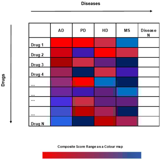 We performed a large-scale computation by calculating the Total Composite Score for each drug in the Drug Repurposing Hub with a total of 4421 drugs for four diseases: AD, PD, HD and MS. The whole pipeline of DReAmocracy, however, can be applied in multiple diseases given the sufficient availability of drug-related a priori information. This can be extended to a greater number of diseases, as shown in Figure 9 (N diseases), and any other database with the same type of data can be used. Moreover, in addition to the different diseases that can be tested, different methods to collect drug lists can be used, such as experimental drug discovery studies. Notably, a better Composite Score can be given when more data are available for the disease of interest, as a higher diversity can be added to the methodology. Therefore, to obtain more reliable results, it is necessary to create a minimum of three drug lists per disease to proceed with the creation of its reference table.