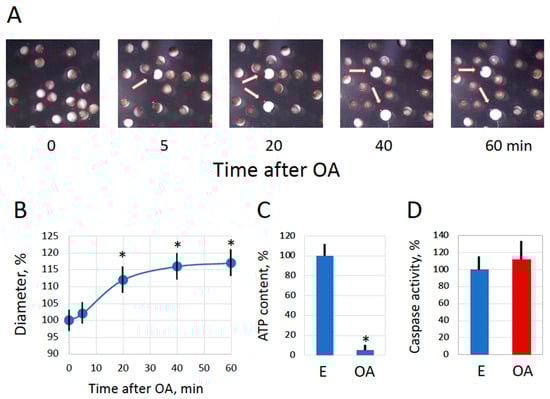 Spontaneous overactivation of ovulated Xenopus eggs. Phenotypical changes in a subpopulation of spawned Xenopus eggs are shown in panel (A). Time “0” refers to the time of egg deposition; the arrows in the panels point to spontaneously overactivated eggs. The progressive increase in the diameter of overactivated eggs and evaluation of intracellular ATP in normal (E) and overactivated (OA) eggs are presented in panels (B,C), respectively. The quantification of caspase activity is shown in panel (D). The OA eggs in panels (C,D) were analyzed one hour after the visually identified beginning of overactivation. The bars in panels (B–D) represent standard deviation, and the asterisks in panels (B,C) indicate statistical difference from the control eggs (p < 0.05). Around one thousand eggs from three independent batches were monitored in panel (A), ten normal and ten overactivated eggs were measured at each time point in panel (B), and five eggs of each cell type were analyzed in panels (C,D).