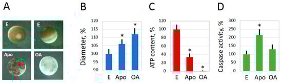 Spontaneous overactivation of in vitro-matured frog eggs. Morphological types of metaphase-arrested (E), overactivated (OA), and apoptotic (Apo) eggs observed in a subpopulation of defolliculated in vitro-matured Xenopus eggs at 24–30 h after addition of 5 μM PG are highlighted in panel (A). Measurements of egg diameter and intracellular ATP are presented in panels (B,C), respectively. Quantification of caspase activity in analyzed cell types is presented in panel (D). Mature overactivated eggs were analyzed one hour after the visually identified beginning of overactivation; metaphase-arrested and apoptotic eggs were examined at 24–30 h after hormone administration. The bars in panels (B–D) represent standard deviation, and the asterisks indicate statistical differences from the control eggs (p < 0.05). Around one thousand eggs from three independent batches were monitored in panel (A), ten eggs of each cell type were measured in panel (B), and five eggs of each cell type were analyzed in panels (C,D).