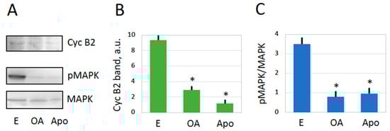 Meiotic exit after spontaneous overactivation. An evaluation of cyclin B2 contents and phosphorylation state of the MAP kinase in metaphase-arrested (E), overactivated (OA), and apoptotic (Apo) eggs is presented. Panel (A) shows representative immunoblots, and data quantification is presented in panels (B,C). Eggs were matured in vitro in the presence of 5 μM progesterone and examined 24–30 h after hormone administration. The immunoblotting samples contained a normalized amount of total protein, 50 μg per lane. The experiment was repeated with three separate batches of eggs, and the results of a single-bath experiment are shown. The bars in panels (B,C) represent standard deviations obtained in four measurements, and the asterisks indicate statistical differences from the control eggs (p < 0.01). More than five cells of each cell type were subjected to the analysis.