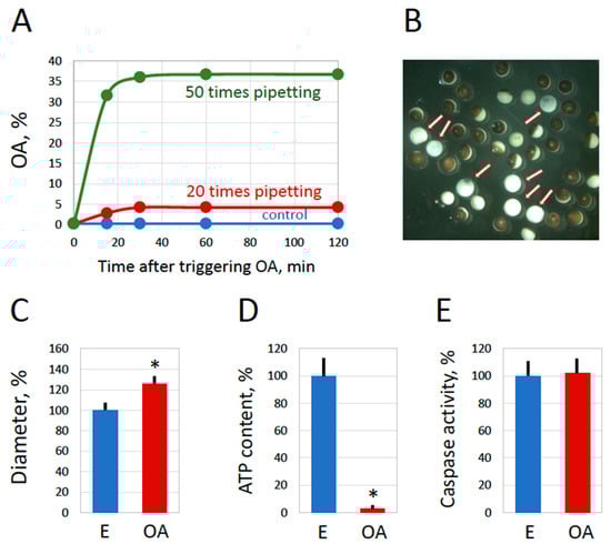 Mechanical stress induces egg overactivation. Overnight-ovulated frog eggs surrounded by a jelly layer were subjected to repeated pipetting through a cut plastic pipette tip. The emergence of overactivated eggs within 2 h after pipetting 20 (red line) or 50 (green line) times is presented in panel (A). A mixed population of normal and overactivated eggs observed 2 h after pipetting is shown in panel (B). The arrows in the panel point to overactivated eggs. Measurements of the egg diameter and intracellular ATP content performed in 2 h after pipetting are presented in panels (C,D), respectively. Panel (E) shows the quantification of caspase activity in control and overactivated eggs. The bars in panels (C–E) represent standard deviations. The asterisks in panels (C,D) indicate statistical differences from the control eggs (p < 0.05). More than five cells of each morphological type were analyzed in panels (C–E).