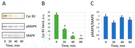 Cyclin B2 content and MAPK phosphorylation in eggs overactivated by mechanical stress. Cyclin B2 content and the phosphorylation state of the MAP kinase were analyzed at different times after the visually identified beginning of overactivation. Panel (A) shows representative immunoblots, and data quantification is presented in panels (B,C). The immunoblotting samples contained a normalized amount of total protein, 50 μg per lane. The eggs were matured in vitro in the presence of 5 μM progesterone and utilized 12 h after hormone administration. The experiment was repeated with three separate batches of eggs obtained from different animals, and the results of a single-bath experiment are shown. The bars in panels (B,C) represent standard deviations obtained in four measurements, and the asterisks indicate statistical differences from the control eggs (p < 0.01). More than five cells were analyzed at each time point.