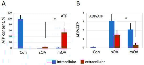 Changes in ATP and ADP levels elicited by egg overactivation. The relative contents of ATP inside and outside spontaneously (sOA) and mechanically (mOA) overactivated eggs, as well as untreated control eggs (Con), are presented in panel (A). Intracellular and extracellular ADP/ATP ratios are evaluated in panel (B). Data for intracellular and extracellular compartments are presented in blue and red, respectively. All measurements were performed one hour after the visually identified beginning of overactivation. The experiment was repeated with four different eggs of each cell type (Con, sOA, and mOA). The bars in the panels represent standard deviations, and the asterisks indicate statistical significance at p < 0.01.