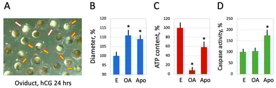 Occurrence of egg overactivation in the frog genital tract. A subpopulation of Xenopus eggs retained in the genital tract for 30 h after hCG injection is shown in panel (A). The white and orange arrows in the panel point to overactivated (OA) and apoptotic (Apo) eggs, respectively. Measurements of egg diameter and intracellular ATP content are presented in panels (B,C), respectively. The quantification of caspase activity in the analyzed cell types is presented in panel (D). The bars in panels (B–D) represent standard deviations. The asterisks in panels (B–D) indicate statistical differences from the control eggs (p < 0.05). More than five cells of each morphological type were analyzed in the panels.