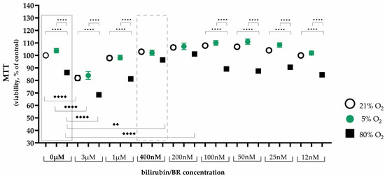 For the initial experiments, an MTT cell viability assay (see Section 4.6) was used to identify the optimal dose of bilirubin (see Section 2.1), i.e., the selection was based on a bilirubin concentration that counteracts the oxidative stress-induced loss of viability. All further analyses are carried out under the three different oxygen concentrations and the selected bilirubin concentration in the medium.