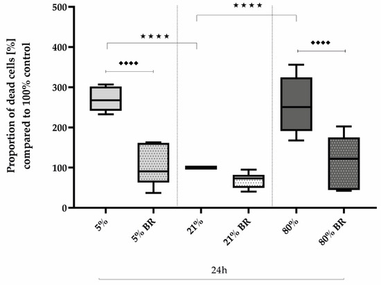 Comparing the effects of low and high oxygen concentrations on the survival of AEC II compared to controls, oxidative stress induced a 2.5-fold increase in the proportion of dead cells after immunocytochemical staining after 24 h of both hypoxia (270%, p < 0.0001) and hyperoxia (256%, p < 0.0001; Figure 2). Bilirubin inhibited increased cell death to the control level of untreated cells at 21% oxygen. The complete data are presented in Supplementary Table S1.