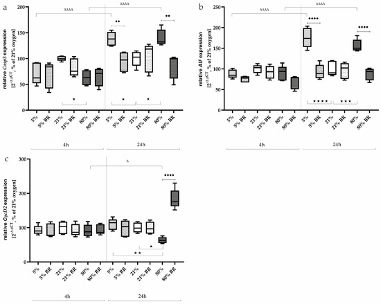 Considering now more differentiated relevant transcripts, the transcription of Casp3 as well as AIF adequately reflected this effect after one day of oxygen exposure. Hypoxia and hyperoxia increased Casp3 expression (Figure 3a) to 138% (p < 0.05) and 140% (p < 0.05) and AIF expression (Figure 3b) to 176% (p < 0.0001) and 156% (p < 0.0001), respectively, compared to normoxia-exposed cells. The bilirubin used at a concentration of 400 nm reduced this increase to normoxia levels (p < 0.01 and 0.0001, respectively; Figure 3a,b). After a shorter exposure interval of 4 h, no effects were observed for AIF, but a reduced expression of Casp3 (63%) under 80% oxygen was observed (Figure 3a). In general, Casp3 and AIF expression increases over a time interval of another 20 h (Figure 3a,b). The complete data are presented in Supplementary Table S2.