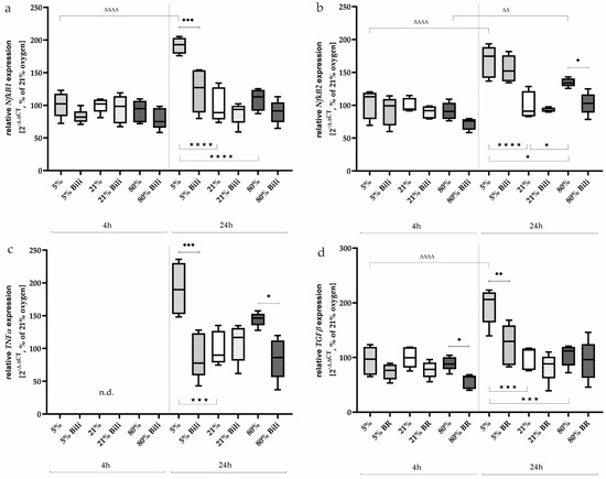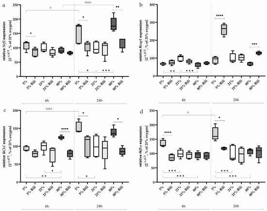 NFκB subunit transcripts (Figure 5a,b) were induced under 5% oxygen (NFκB1: 192%, p < 0.001; NFκB2: 167%, p < 0.0001) and 80% oxygen (NFκB2: 135%, p < 0.05) after 24 h of incubation compared to normoxia. Bilirubin treatment was able to downregulate NFκB1 under hypoxia-induced (p < 0.001, Figure 5a) and NFκB2 (p < 0.05, Figure 5b) under hyperoxia-induced conditions. The NFκB1/2 transcripts were not modified at the 4 h time point.