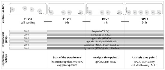 Experimental setup for the cell culture of this study. The AEC IIs were seeded in the appropriate number of cells (DIV 0). After 24 h under normal culture conditions (DIV 1), the medium was completely changed and added according to the experimental groups with or without bilirubin and exposed to the corresponding oxygen conditions. The cell cultures were incubated under the experimental conditions for up to 4 h (DIV 1, 4 h) or 24 h (DIV 2, 24 h) without any further changes and then analyzed immediately afterward.