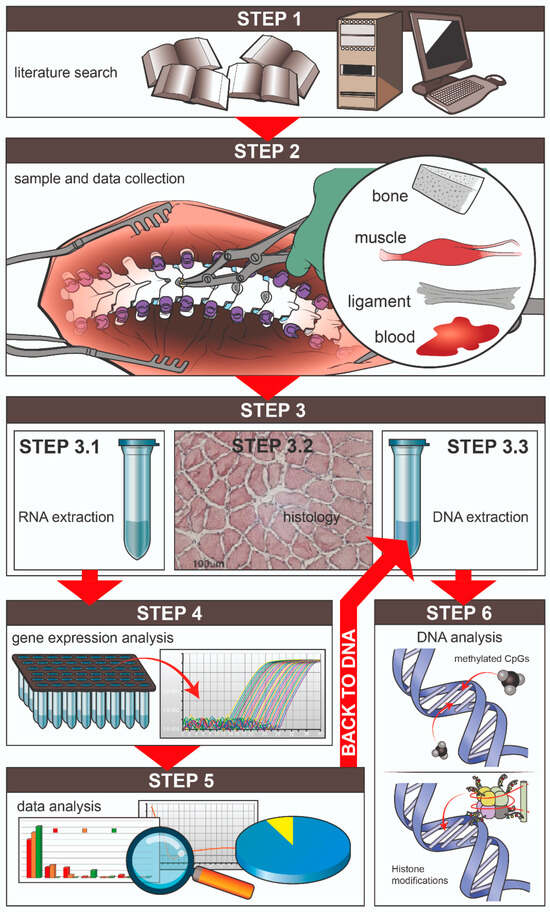 Figure 1 and described in detail below. They include the following: identification of the promising epigenetic biomarkers from available literature data; recruitment of donors and associated clinical data; collection of surgical samples from donors’ paravertebral muscle, bone, and ligament together with peripheral blood; DNA and RNA extraction from samples; analysis of gene expression of the putative biomarkers in the different tissues followed by study of the epigenetic mechanisms of regulation of gene expression in the DNA of the same samples. In the following sections, the hypothesis made for the implementation of the steps of the proposed protocol is described.