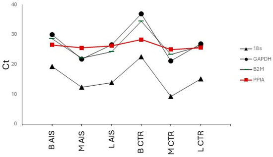 PPIA (peptidylprolyl isomerase A) gene, a trans-isomerase enzyme involved in protein folding, demonstrated the best consistency in our experimental model and is therefore suggested as the principal reference. However, the analysis conducted here should be interpreted with respect to some limitations due to the small number of cases. We acknowledge that the characteristics and clinical histories of the three AIS patients and of the control patient may not be representative of the corresponding population. Therefore, attention should be paid before generalizing the results, and it cannot be excluded that in a wider case series, other housekeeping could display higher consistency and represent a better choice.