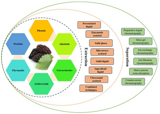 - Ma, G.; Chai, X.; Hou, G.; Zhao, F.; Meng, Q. Phytochemistry, Bioactivities and Future Prospects of Mulberry Leaves: A Review. Food Chem. 2022, 372, 131335. [Google Scholar] [CrossRef] [PubMed]