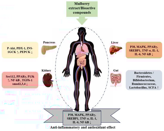 | Mulberry leaf extract | Male ICR rats | Water | Antioxidant and anti-inflammatory | TNF-α; Toll-like receptors (TLR)-2; Myeloid differentiation factor (MyD)-88, TNF receptor-associated factor 6 (TRAF6), Nuclear factor-kappa-B (NF-κB) p65; Insulin receptor substrate (IRS)-1 ↓, Insulin receptor substrate(InsR) ↑ | [131] |