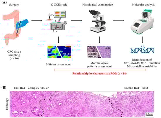 Schematic representation of study design. (A) The main steps: surgery and sampling of CRC tissue, ex vivo C-OCE study to evaluate elastic properties of fresh CRC samples, histological examination to identify the CRC morphological patterns, and subsequent molecular analysis of these patterns to detect the presence of gene alterations. (B) An example of delineation of two different morphological patterns (by two different regions of interest (ROI)) within one specimen. For two ROIs—complex tubular (left) and solid (right)—C-OCE and molecular analysis were separately performed, while the central tissue region with a mixed morphology was not assessed; scale bar size is shown in image.