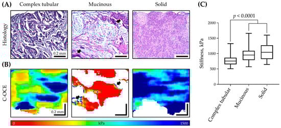 The results of C-OCE study of three CRC morphological patterns by ROIs: representative histological (A) and corresponding C-OCE (B) images for complex tubular, mucinous, and solid CRC morphological patterns; arrows in images of mucinous patterns indicate glandular cancerous structures—small areas of high stiffness values; scale bar size is shown in images. (C) Diagram of stiffness values distribution for three CRC morphological patterns. In the box plot, the central line represents the mean value, the upper and lower bounds indicate the standard deviation, and the whiskers indicate the minimum and maximum values; Mann–Whitney U test with Bonferroni correction was used to determine statistically significant differences.