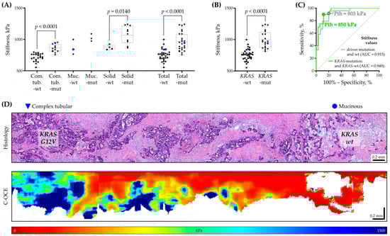Comparison of tissue stiffness and the presence of CRC driver mutations. (A) Diagram of distribution of average stiffness values for CRC ROIs (for three CRC morphological patterns and total) depending on the presence or absence of driver mutations (KRAS/NRAS/BRAF). In the box plot, the central line represents the mean value, the upper and lower bounds indicate the standard deviation, the whiskers indicate the minimum and maximum values; each symbol is a mean stiffness value calculated by ROI in C-OCE image, the symbol shape indicates the following: triangle—KRAS gene mutation; square—NRAS gene mutation; diamond—BRAF gene mutation; dot—absence of any of the above driver mutations; symbols associated with case #21 are shown in blue. Mann–Whitney U test with Bonferroni correction was used to determine statistically significant differences. Designations: Com.tub.—complex tubular, Muc.—mucinous, wt—wild type, and mut—driver mutation. (B) Diagram of a distribution of average stiffness values for CRC ROIs with a KRAS driver mutation and KRAS wild-type. In the box plot, the central line represents the mean value, the upper and lower bounds indicate the standard deviation and the whiskers indicate the minimum and maximum values; each symbol is a mean stiffness value calculated by ROI in C-OCE image. (C) ROC curves showing the relationship between stiffness values and driver mutations: for a situation of presence/absence (wild type) of driver mutations (gray line), stiffness threshold (Pth) is equal to 803 kPa, AUC = 0.915; for a situation of presence/absence (wild type) of KRAS driver mutation (green line) Pth = 850 kPa, AUC = 0.949. ROC—receiver operating characteristic; AUC—area under ROC-curve. (D) Demonstration of the results of histological and C-OCE study for CRC case #21, where morphological intratumoral heterogeneity and corresponding heterogeneity in stiffness values were detected. The first ROI of complex tubular pattern (on the left side in images) with KRAS G12V driver mutation is characterized by high stiffness values, and the topologically separated second ROI of mucinous pattern (on the right side in images) without KRAS driver mutation (KRAS wild-type) has lower stiffness.