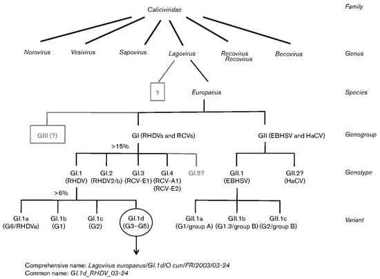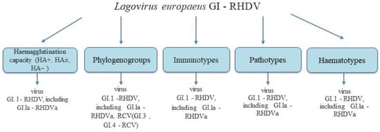 According to the currently proposed systematics (Figure 1), within Lagovirus europaeus GI–RHDV viruses, which belong to the family Caliciviridae, a distinction is made between the genogroup GI–RHDV/RCV (rabbit haemorrhagic disease virus/rabbit calicivirus) and the genogroup GII–EBHSV/HaCV (European brown hare syndrome virus/hare calicivirus), in which genotypes have been distinguished. In the genogroup GI–RHDV/RCV, four genotypes have been described (GI.1–GI.4), comprising the genotype GI.1, including the antigenic variant of these viruses GI.1a–RHDVa, which are pathogenic viruses, and the genotype GI.2, which are also pathogenic viruses previously identified as RHDV variants—RHDVb or RHDV2, now GI.2–RHDV2/b. In contrast, the genotypes GI.3 and GI.4 are non-pathogenic RCV viruses, including RCV–E1, RCV–E2 and RCV–A1 [1]. On the other hand, in the genogroup GII–EBHSV/HaCV, two genotypes (GII.1 and GII.2) are distinguished, except that the genotype GII.1 represents EBHS viruses pathogenic to hares, within which three variants are distinguished (GII.1a, GII.1b and GII.1c), while the genotype GII.2 is represented by HaCV viruses non-pathogenic for these animals, which show 79% similarity to viruses of the genotype GII.1–EBHS [1,2]. However, according to Mahar et al. [3], they form, in addition to the genotypes GII.2, GII.3 (HaCV–A1), GII.4 (HaCV–A2) and GII.5 (HaCV–A3) [3].