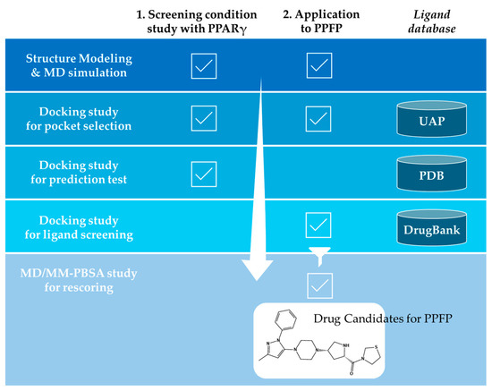 As depicted in Figure 1, the goal of this study was to predict promising binders for the PPFP using a database of drugs or drug-like compounds through docking calculations. To this end, it was necessary to select PPFP structures suitable for docking from the MD trajectories of apo-PPFP and PPFP–rosiglitazone complexes modeled in our previous study [19]. Although the position of the PPARγ-derived ligand-binding pocket is the same for all of them, their shapes are slightly different. Here, we first established a protocol to select structures suitable for docking using PPARγ, for which there is abundant knowledge on co-crystal structures and binding affinities with active compounds. We then applied this protocol to the PPFP, for which there is no prior information on its activity or structure, to propose binders as promising target drug candidates.