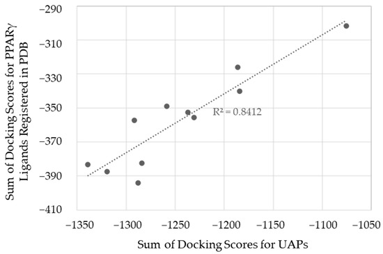 To verify the performance of the UAP protocol on the PPARγ target, we prepared a compound set consisting of 41 PPARγ binders with co-crystal structures registered with PPARγ in the PDB and at least one of the activity values of IC50, Kd, or Ki reported in ChEMBL. Then, the sums of the docking scores for the compound set with the 11 PPARγ structures were compared to those of the UAP set to investigate the ability of UAP set for distinguishing the quality of pockets instead of real ligands. Figure 2 shows the correlation between the sum of docking scores for the 11 structures in the UAP- and PDB-derived compound sets. The high correlation coefficient, R2 = 0.84, suggests that the UAP protocol would be applicable to PPARγ for the selection of good pockets for screening with high probability. We then suppose that the UAP protocol could also be applied to the selection of appropriate pocket structures in the PPFP, where no experimental data on structure and affinity are available. However, when employing highly diverse UAPs, consideration should be given to keeping the rate of false positives low, which is important in ligand screening. This issue was addressed in this study through combined use of docking score and binding free energy by the MM/PBSA method as a posteriori justification.