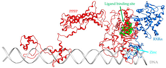 Ribbon drawing of PPFP/RXRα on DNA. Red denotes the PPFP and blue RXRα. The PPARγ used for modeling PPFP is known to form a dimer with RXRα. Zinc ions are shown as balls. The ligand-binding pocket in PPFP is shown in green.