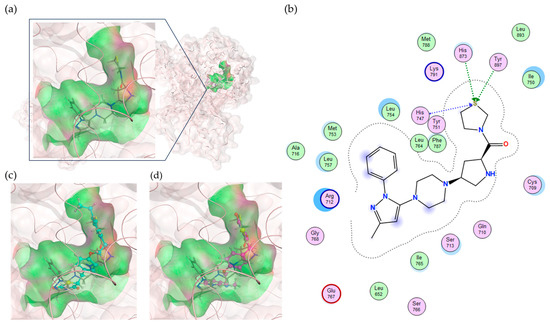 Binding pose of tenegliptin (L72) in PPFP. (a) Three-dimensional view, where L72 is represented by stick. (b) Two-dimensional view. (c) Superposition of L72 (stick) to pioglitazone (cyan) in binding pocket. (d) Superposition of L72 (stick) to rosiglitazone (magenta) in binding pocket.