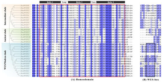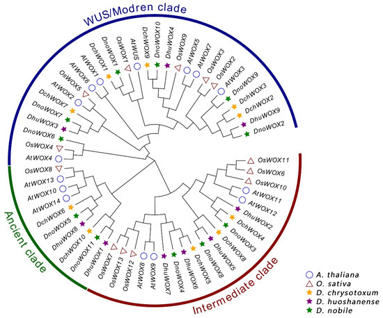 - Li, H.; Li, C.; Wang, Y.; Qin, X.; Meng, L.; Sun, X. Genome-Wide Analysis of the WOX Transcription Factor Genes in Dendrobium catenatum Lindl. Genes 2022, 13, 1481. [Google Scholar] [CrossRef] [PubMed]