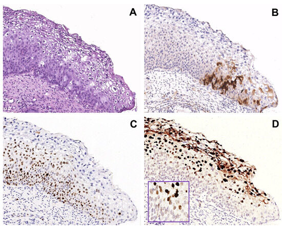 - Cabibi, D.; Giovannelli, L.; Martorana, A.; Migliore, M.C.; Tripodo, C.; Campione, M.; Ammatuna, P.; Aragona, F. Predictive role of histological features and Ki67 pattern on high-risk HPV presence in atypical cervical lesions. Histopathology 2007, 51, 713–716. [Google Scholar] [CrossRef]