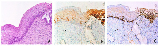 Cervical biopsy with mild epithelial atypia, mixed pattern of P16 expression and Ki67 expression: serial sections. (A) The biopsy shows mild atypia. (B) On the left weak/focal p16 expression; on the right block-like p16 expression positivity, diffuse in all the squamous layers. (C) Ki67 immunohistochemical staining showed a mild increase of proliferating cells in w/f p16 area and a strong increase in block-like p16 positive area. Original magnifications: 100×; (A) hematoxylin and Eosin staining; (B,C) immunoperoxidase staining with 3,3’-diaminobenzidine (DAB) chromogen. Adapted from Cabibi et al., Diagnostics (Basel), 2021 [16].