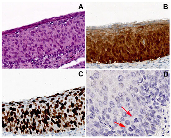 Group 2 case: serial sections of cervical biopsy with H-SIL, block-like p16 expression, and HPV16. (A) Biopsy shows H-SIL. (B) Block-like p16 positivity, strong and diffuse in all the squamous layers. (C) Ki67 immunohistochemical staining highlighting a high proliferation index with widespread positivity extended to the upper epithelial layers. (D) CISH showed an isolate punctate pattern of positivity in rare nuclei of the lower third of the epithelium, suggesting the integration of HPV. Atypical mitoses are visible (arrows). Original magnifications: (A–C) 200×; (D) 400×; (A) hematoxylin and eosin staining; (B,C) immunoperoxidase staining with 3,3’-diaminobenzidine (DAB) chromogen; (D) chromogenic in situ hybridization staining (CISH).