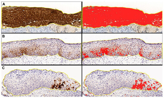 Representative images of “digital pathology evaluation” performed with QuPath software on p16 digital slides, with original DAB-stained images (left) and the relative digital detection of DAB signal in red (right). (A) Block-like positive case. (B,C) Weak and/or focal positive cases.