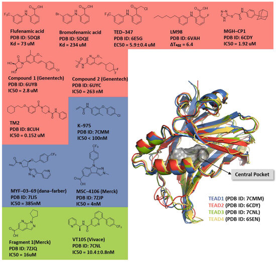- Pobbati, A.V.; Han, X.; Hung, A.W.; Weiguang, S.; Huda, N.; Chen, G.-Y.; Kang, C.; Chia, C.S.B.; Luo, X.; Hong, W.; et al. Targeting the Central Pocket in Human Transcription Factor TEAD as a Potential Cancer Therapeutic Strategy. Structure 2015, 23, 2076–2086. [Google Scholar] [CrossRef] [PubMed]