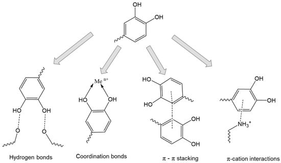 | Catechol-based biopolymers | Catechol moieties provide extremely strong adhesion, even in wet environments, as well as broad possibilities for conjugation with bioactive molecules. Catechol moieties can be formed by additional coordination bonds, π-π stacking, and π-cation interactions. |