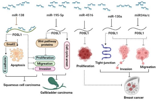 The ectopic expression of FOSL1 was reported in several types of malignancy. Recent studies have shown that several miRNAs target FOSL1 and regulate its expression, leading to the modulation of various cellular functions. It has been reported that the downregulation of miRNAs can result in increased expression of FOSL1 in various cancers [27,28,29]. (1) Breast cancer (BC): The expression levels of miR34a/c in patients significantly decreased in patients with metastatic breast tumors as well as in the metastatic cancerous cell lines MDA-MB-231 and Hs578T. In vitro and in vivo studies reveal that ectopic expression of the two miR34a/c suppressed the invasion and migration of cancerous breast cells. Yang et al. reported that overexpression of miR34a/c can directly bind to 3′ UTR-FOSL1, consequently inhibiting its expression at both mRNA and protein levels [30]. It has been reported that elevated levels of FOSL1 in triple-negative breast cancer (TNBC) patients are associated with poor survival. miR-4516 target genes such as FOSL1 are involved in the regulation of proliferation [31]. They demonstrated a significant downregulation of miR-4516 expression in patients with invasive ductal carcinoma [31]. Furthermore, their findings revealed that the overexpression of miR-4516 significantly inhibited the proliferation of TNBC cells by targeting the FOSL1 gene [31]. In addition, ectopic expression of miR-130a targets FOSL1 and suppresses invasion and migration in invasive breast cancer Hs578T and MDA-MB-231 cell lines. The overexpression of miR-130a led to an increase in ZO-1 expression, a tight-junction protein, through the downregulation of FOSL1 [29]. miR-19a-3p has also been implicated in the regulation of FOSL1 in tumor-associated macrophages (TAMs). The downregulation of miR-19a-3p results in the accumulation of FOSL1 in TAMs, which in turn promotes the invasion and metastasis of breast cancer cells [32]. (2) Colorectal cancer (CRC): The downregulation of miR34a/c and miR-15/16-family member miR-497 has been observed in CRC. This downregulation plays a significant role in promoting neoplastic cell invasion and EMT driven by FOSL1. These miRNAs are known to target FOSL1, leading to its upregulation and subsequently, the activation of genes involved in EMT and metastasis [33,34]. (3) Gallbladder carcinoma (GC): In gallbladder cancer, miR-195-5p has been identified as being downregulated, and this downregulation promotes cell proliferation, migration, and invasion. It achieves this effect by targeting FOSL1, which, in turn, activates the Wnt/β-catenin signaling pathway [28]. In vitro investigations revealed that overexpression of miR-195-5p in NOZ and GBC-SD gallbladder carcinoma cell lines not only suppressed proliferation, invasion, and migration but also induced cell cycle arrest in the G0/G1 phase. miR-195-5p exerts this function via targeting FOSL1 and inhibiting the expression of proteins including β-catenin, CCND1, and c-Myc that are involved in the Wnt signaling pathway [28]. (4) Squamous cell carcinoma (SCC): miR-138 is a tumor suppressor that regulates the expression of various oncogenes, including FOSL1. In squamous cell carcinoma, the down-regulation of FOSL1 by microRNA-138 may inhibit cell proliferation and invasion [35]. In this paper, Yi et al. reported that miR-138 binds directly to the 3′-UTR of FOSL1, leading to a decrease in its expression. Moreover, miR-138 was found to indirectly regulate FOSL1 target genes, including Snail2. Subsequently, Snail2 was observed to have an effect on E-cadherin expression. They also discovered that miR-138 can bind not only to the 3′-UTR of FOSL1 but also to the 5′-UTR and coding region of FOSL1. In summary, the miR-138/FOSL1/Snail2 axis plays a pivotal role in the progression of squamous cell carcinoma [35]. (5) Glioma: FOSL1, functioning as a transcriptional factor, has exhibited upregulation in several tumors, including glioma. Rong et al. demonstrated that radiotherapy treatment leads to the induction of apoptosis and inhibition of cell viability in the glioma cancer stem cell (CSC) lines CSC-U-251MG and CSC-A172. After radiotherapy, the expression of FOSL1, miR-27a-5p, and Bcl-2 remarkably decreased, while Bax and cleaved caspase-3 increased. Using bioinformatics tools, they have demonstrated that FOSL1 exhibits a significant signal in the promoter region of miR-27a-5p. Remarkably, the silencing of FOSL1 sensitizes glioma cancer stem cells through the downregulation of miR-27a-5p, whereas the ectopic expression of FOSL1 reduces the effectiveness of radiotherapy on apoptosis and cell viability by modulating miR-27a-5p [27] (Figure 1).