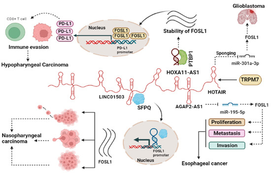 Several studies reported the involvement of lncRNAs such as HOTAIR [26], AGAP2-AS1, LINC01503, and HOXA11-AS1 in the regulation of FOSL1 in cancer [24,25,36]. Our investigation revealed that the lncRNA HOTAIR functions as a competitive endogenous RNA (ceRNA) by sequestering miR-301a-3p and subsequently controlling the expression of FOSL1 indirectly [26]. (1) GBM: TRPM7 is one of the members of channel TRP superfamily that has a pivotal role in malignancy. Our group reported that TRPM7 serves as a positive regulator of lncRNA HOTAIR and contributes to gliomagenesis. In glioblastoma, HOTAIR accelerates tumor progression by acting as a sponge for miR-301a-3p, leading to an increase in the expression of FOSL1, a key player in glioma progression. Silencing of HOTAIR results in increased miR-301a-3p expression, leading to the suppression of FOSL1 and subsequently reducing cell proliferation, invasion, and migration [26]. (2) In esophageal cancer (EC), AGAP2-AS1 sponges miR-195-5p and subsequently upregulates FOSL1, which in turn increases the proliferation of cancerous cells, metastasis, and invasion. The knockdown of AGAP2-AS1 leads to the promotion of miR-195-5p expression, which, in turn, inhibits FOSL1 ectopic expression, subsequently impeding tumor progression. Moreover, this knockdown also increases apoptosis and causes cell cycle arrest in the G0/G1 phase [25]. (3) In nasopharyngeal carcinoma (NPC), LINC01503 recruits splicing factor proline- and glutamine-rich (SFPQ) protein and colocalizes in the nucleus. They jointly bind to the promoter region of FOSL1 genes, thereby promoting their expression. It can be concluded that the LINC01503/SFPQ/FOSL1 axis is involved in different aspects of NPC development including cell proliferation, migration, invasion, tumor growth, and metastasis [24]. HOXA11-AS1 lncRNA plays a critical role in metastasis in hypopharyngeal squamous cell carcinoma (HSCC). It achieves this function by regulating the mRNA stability of FOSL1 through its binding to PTBP1, which acts as a key regulator of tumorigenesis. On the other hand, FOSL1 binds to the PD-L1 promoter, leading to increased PD-L1 expression and promoting immune escape. Taken together, the interaction between HOXA11-AS1, FOSL1, PTBP1, and PD-L1 forms a crucial axis that collectively enhances proliferation, metastasis, immune escape, and tumor growth [36] (Figure 2).
