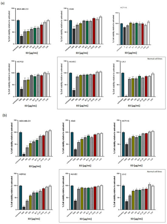A panel consisting of 4 cancer cell lines and 2 normal cell lines was chosen for in vitro testing of essential oils: triple-negative breast cancer (MDA-MB-231), lung cancer (A549), liver cancer (HEPG2), colon cancer (HCT116). The HUVEC endothelial cell line and LX-2 hepatic stellate cell line was chosen as normal cell lines. All cell lines were maintained in a humidified chamber at 37 °C and 5% CO2. All reagents required for cell culture were purchased from Gibco (Dublin, Ireland). Cell lines included in this study were purchased from American Type Culture Collection (ATCC) and provided by the laboratory biobank [46].