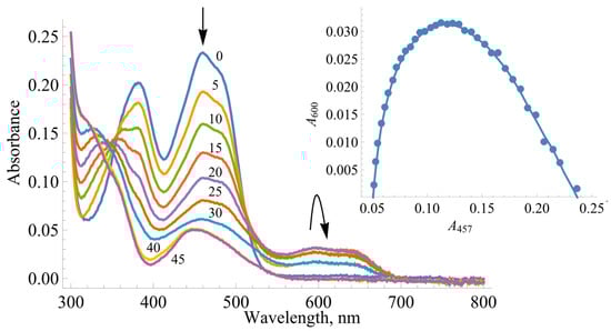 The determination of the redox potentials of BsFNR. The photoreduction of 20 µM of BsFNR at different times of illumination, with the arrows indicating the changes in the spectra. The numbers next to the curves correspond to the total duration of illumination in minutes. Inset shows the interdependence of absorbance changes at 457 and 600 nm during the photoreduction of 20 µM of BsFNR.
