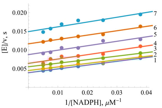 Lineweaver–Burk plots of the steady-state kinetics of the oxidation of NADPH catalyzed by BsFNR with varied concentrations of juglone (5-hydroxy-1,4-naphthoquinone): 1—200 µM of juglone, 2—133 µM of juglone, 3—89 µM of juglone, 4—59 µM of juglone, 5—39 µM of juglone, 6—26 µM of juglone, and 7—17 µM of juglone.