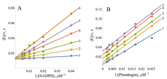 Inhibition of BsFNR-catalyzed reactions by the reaction product NADP+. (A) Competitive inhibition at varied concentrations of NADPH in the presence of 200 µM of plumbagin (5-hydroxy-2-methyl-1,4-naphthoquinone): 1—no NADP+, 2—100 µM of NADP+, 3—250 µM of NADP+, 4—500 µM of NADP+, 5—750 µM of NADP+, and 6—1000 µM of NADP+. (B) Uncompetitive inhibition at varied plumbagin concentrations in the presence of 100 µM of NADPH: 1—no NADP+, 2—500 µM of NADP+, 3—1000 µM of NADP+, 4—2000 µM of NADP+, and 5—3000 µM of NADP+.