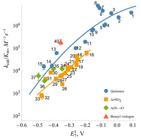 The log values for ArNO2 exhibit a linear dependence on their values (Table 1, Figure 5), with tetryl (16) being the most potent electron acceptor in that group. On the other hand, the log values for quinones with a similar are about an order of magnitude higher. Moreover, quinones and aromatic N-oxides together exhibit a distinct parabolic dependence on their values (Figure 5). One should also note the single-electron acceptor benzyl viologen (40), with its steady-state kinetic constants being close to those of quinones with similar values.