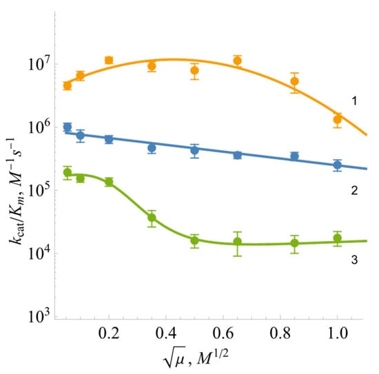 The dependence of log kcat/Km of BsFNR-catalyzed reaction on the ionic strength of the buffer: 1—potassium ferricyanide, 2—1,4-naphthoquinone, and 3—benzyl viologen.