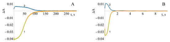 The absorbance changes at 460 nm (1, orange) and 600 nm (2, blue) during the reduction of BsFNR (5 µM) by 50 µM of NADPH and its subsequent reoxidation by O2 (A) or 250 µM of duroquinone (B) (concentrations were reported after mixing).